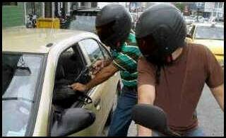 LA VEGA.-En la foto puede notarse como es que está el país, atracadores a plena luz del día realizan su jornada delincuencial. Estos dos atracadores fueron fotografiados a escondida por un transeúnte cuando atracaban pistola en mano, esta tarde a un conductor de un vehículo en la ciudad de La Vega.