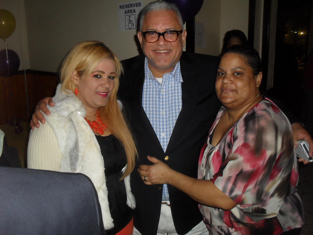 NEW YORK.- El cónsul general dominicano en la ciudad de New York, Luis Lithgow mientras recibe felicitaciones por parte de dos damas mocanas; Paula Tejada y Margarita Ferrer, mientras participaban en el fiestón típico del PLD, en el condado de Brooklyn.
