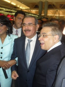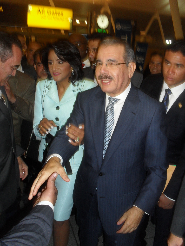 AEROPUERTO JFK,- El presidente Danilo Medina, quien arribó a esta terminal a eso de las 11:00 de la noche, saludó con gran entusiasmo y alegría a la comitiva de peledeístas que se congregó a la entrada de abordaje del aeropuerto internacional, que le recibió y que encabezó el Cónsul General dominicano en la Gran Manzana, Luis Lithgow, Roberto Rodríguez Marchena, director general de comunicaciones del gobierno, los embajadores dominicanos, Frank Cortorreal, Aníbal de Castro y Marcos Montillas, entre otros funcionarios del gobierno.