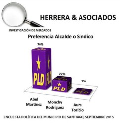 SANTIAGO. El licenciado Abel Martínez Durán es el favorito para ganar las elecciones internas de la candidatura a Alcalde del PLD por Santiago con un 76%, contra un 22% de Monchy Rodríguez, su más cercano contendor a esa posición electiva”, según los resultados presentados este lunes por la firma encuestadora Herrera y Asociados.
