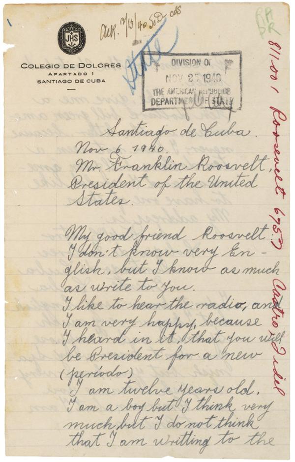 CUBA.-En el noviembre de 1940, cuando tenía 14 años, Fidel Castro le mandó una carta escrita de su puño y letra al entonce presidente de Estados Unidos, Franklin Delano Roosevelt.