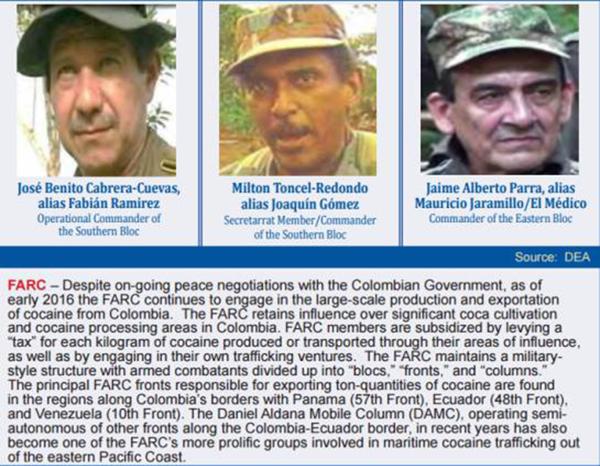 El informe también destacó al Clan Úsuga, Los Rastrojos y las FARCcomo los narcotraficantes que dominaron los envíos de droga en el 2015, e incluyó fotografías de tres guerrilleros a los que señala como cabecillas de las operaciones.