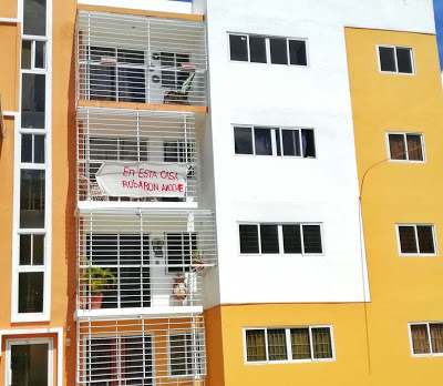Los ocupantes del apartamento 3-2, ubicado en el residencial Alegro I, carretera Buena Vista, colocaron el letrero por la indagación que dicen sentir ante los constantes robos que se producen en ese residencial y otros ubicados en la zona.