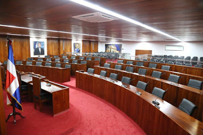 La moderna Sala de Sesiones del Concejo de Regidores del Ayuntamiento de Santiago, cuenta con un área directiva constituida por el presidente y vicepresidenta de la sala y demás entidades, área de regidores, área de Prensa y un área para el público.