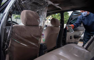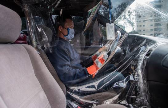 Emilio, quien lleva 15 años trabajando como taxista, explica que el método es sencillo: un plástico fuerte transparente para pegado con tape alrededor de su asiento, el cual sirve como un aislante, y un frasco con alcohol en gel instalado en la parte trasera, para que sus clientes se desinfecten las manos.