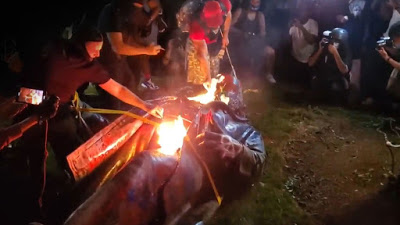 Después de que el monumento del general de brigada Albert Pike fuera derrumbada, los manifestantes le prendieron fuego. Un video muestra a uno de los activistas vertiendo lo que parece ser un líquido inflamable sobre la estatua en llamas, mientras el resto le aplaude.