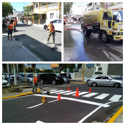 Las labores incluyeron señalizaciones de calles y avenidas, pintado de postes del tendido eléctrico, eliminación de letreros en paredes y muros, mientras camiones bombos lanzaban abundante agua, dejando las áreas de los mercados completamente limpias y en orden.