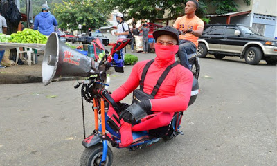 En la parte frontal carga su celular con cámara encendida y un megáfono, con el que alerta a los conductores durante su desplazamiento, o para enviar un mensaje cristiano, y pedir ayuda económica. Esto último no le agrada solicitarlo a viva voz.