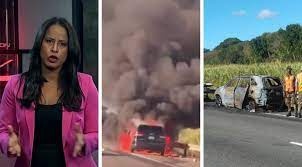 SAN CRISTOBAL.-Se quema vehículo de la periodista de investigación Addis Burgos tras accidentarse en la carretera de San Cristóbal- Baní. Al momento del siniestro se encontraba junto a su familia.