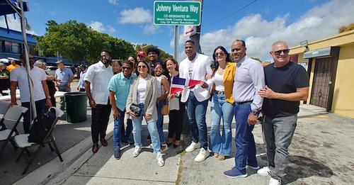 MIAMI, Florida. – La calle 16 de SW en el tramo de la 22 avenida en esta ciudad fue designada como Johnny Ventura Way, en un emotivo e histórico acto con la presencia de todos los familiares del famoso merenguero dominicano.