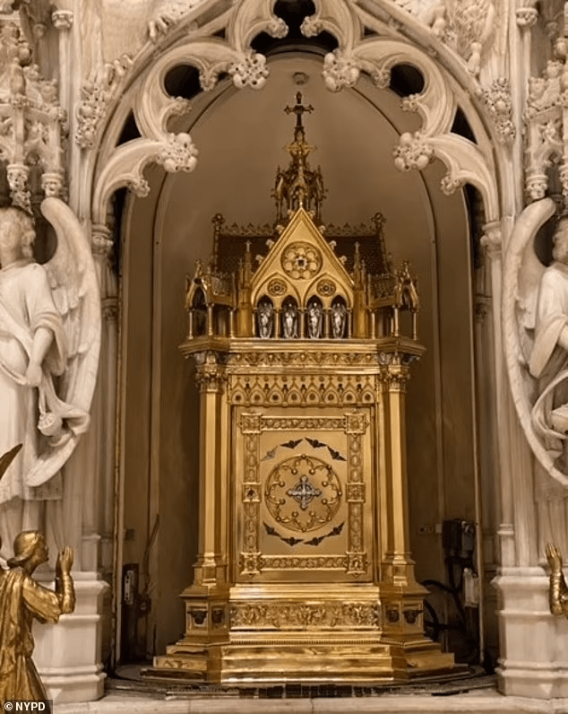 El informe policial agrega que los descarados cortaron una bodega gigante en el tabernáculo rompieron con equipo desconocido y extrajeron de un tabernáculo de oro de 18 quilates con joyas de su estructura.