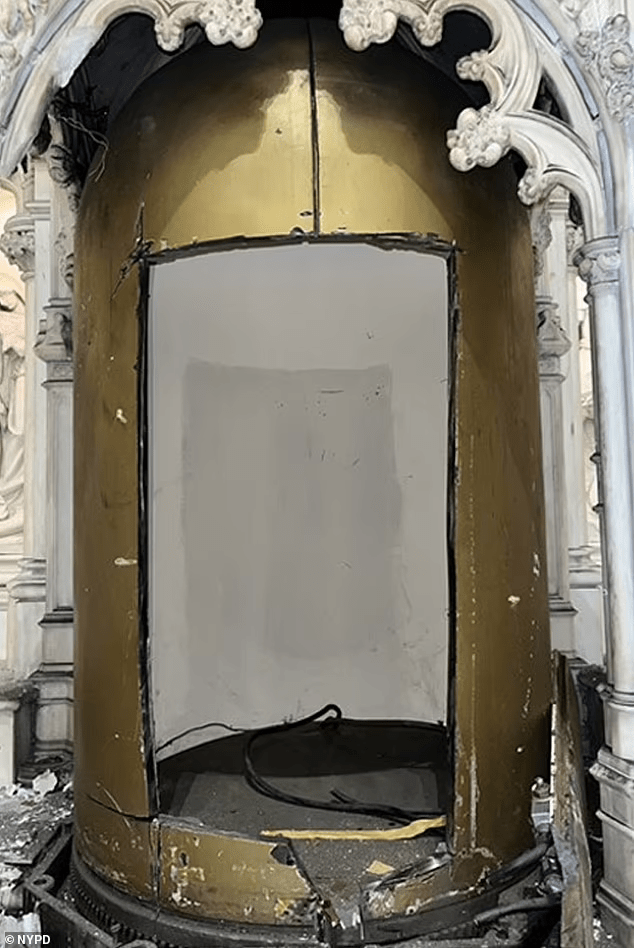 El agujero hecho por los ladrones, no se cortó hasta el fondo y no está claro, especifica la NYPD, como lograron sacar la estructura de su cubículo y sacarla de la iglesia.