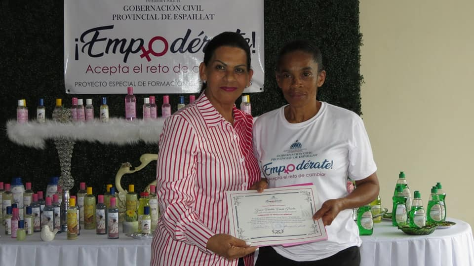 MOCA, Espaillat.-La Honorable Gobernadora de la provincia Espaillat, señora Juana Rosario de Candelier, entregó los certificados de participación a decenas de mujeres emprendedoras de Espaillat, que se prepararon en el curso elaboración de productos químicos, a través del Proyecto Especial de Formación de emprendedoras “Empodérate”.