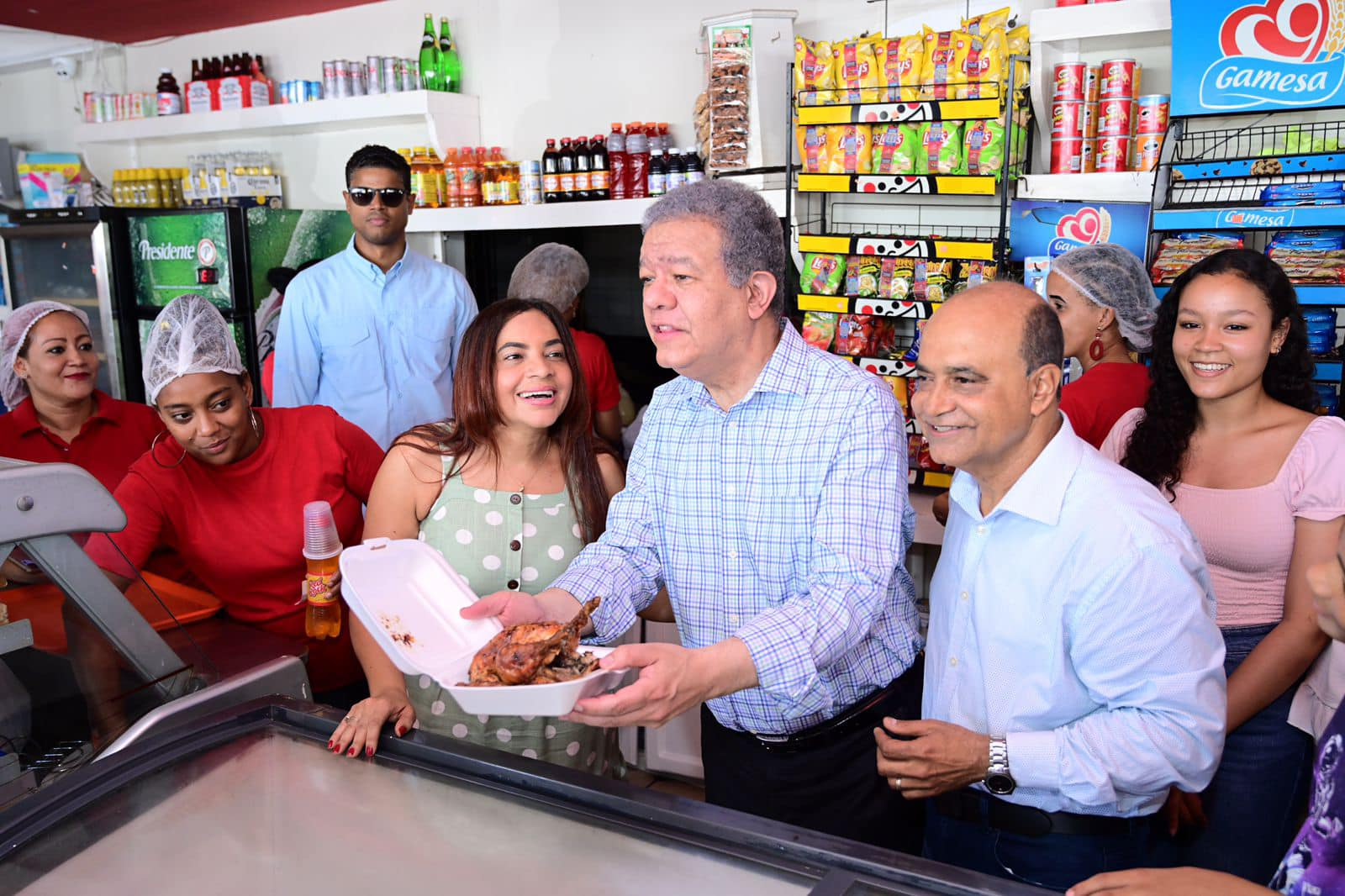 Sonrientes y emocionados los empleados del restaurante El Provocón 4to. agradecieron el gesto de humildad del ex presidente Leonel Fernández, quien mostró en el mostrador el suculento y exquisito pollo y la rica comida que allí se sirve y que mostró junto a la señora Eridania Llibre y el empresario Rafael Torres Madera.