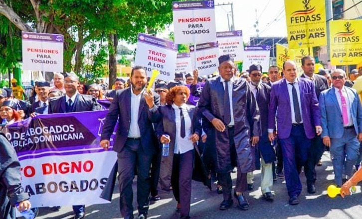 SANTO DOMINGO.-Cientos de abogados marcharon este miércoles hasta la Superinentendencia de Pensiones exigiendo el derecho a pensiones por edad, vejez, discapacidad y de seguro médico para los profesionales que laboran de manera independiente, como está contemplado en la Ley de Seguridad Social 87-01.