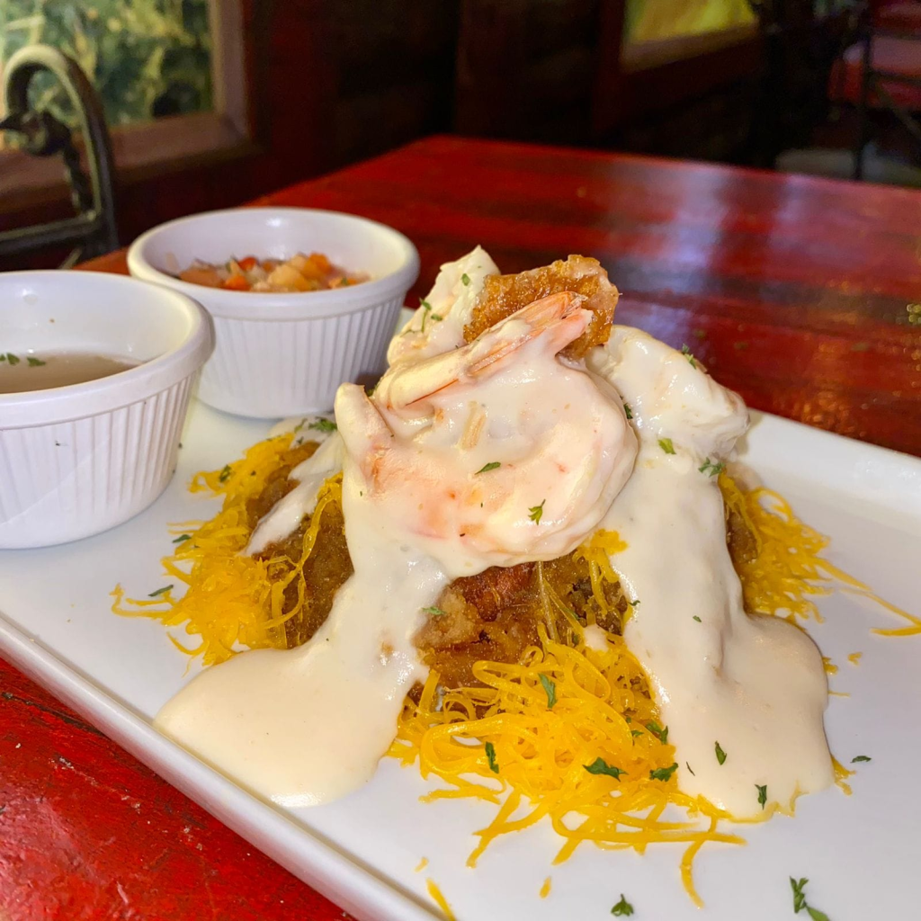 Nuestro mofongo clásico al cual añadimos unos deliciosos camarones en salsa blanca.