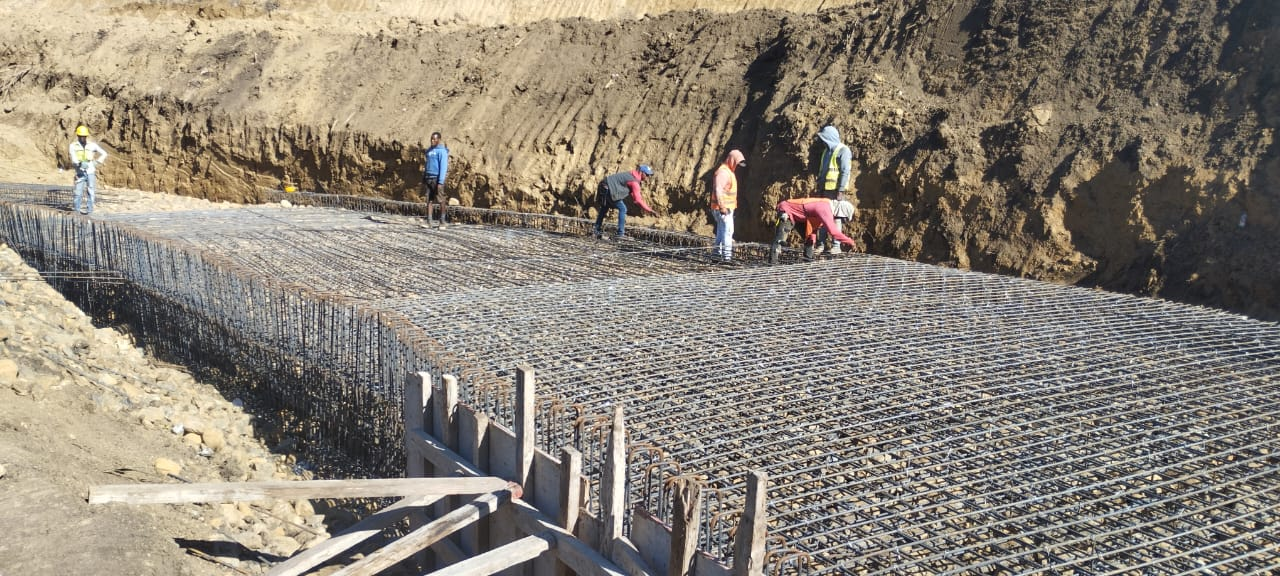 En la zona de construcción se ven conforme a las autoridades del gobierno, trabajadores en plena faena del emparrillado en la estructura de cimentació, zapata