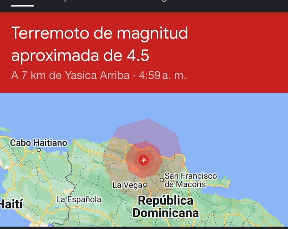 El temblor de tierra se registro esta madrugada a las 4.59, cuyo epicentro se localizó a unos 7 kilómetros de Yasica arriba y a 13 del municipio de Moca, también se sentio una replica de menos intensidad.