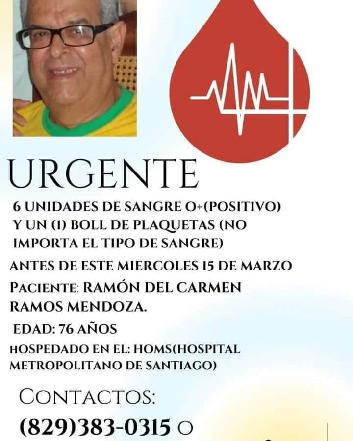 MOCA, Espaillat.-El profesor Ramón Ramos Mendoza, quien fuera director del liceo matutino Domingo Faustino Sarmiento y vespertino Eladio Peña de La Rosa, será operado este miércoles 15 de marzo en el Hospital Metropolitano de Santiago HOMS, mientras que sus familiares solicitan donación de sangre O+ y plaquetas.