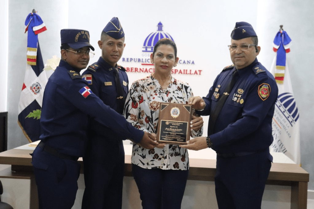 MOCA,Espaillat.-La gobernadora de la provincia Espaillat, señora Juana Rosario de Candelier, recibió un reconocimiento del Cuerpo de Bomberos del municipio de San Víctor, como agradecimiento a los aportes realizado por esta funcionaria a la institución de servicios.