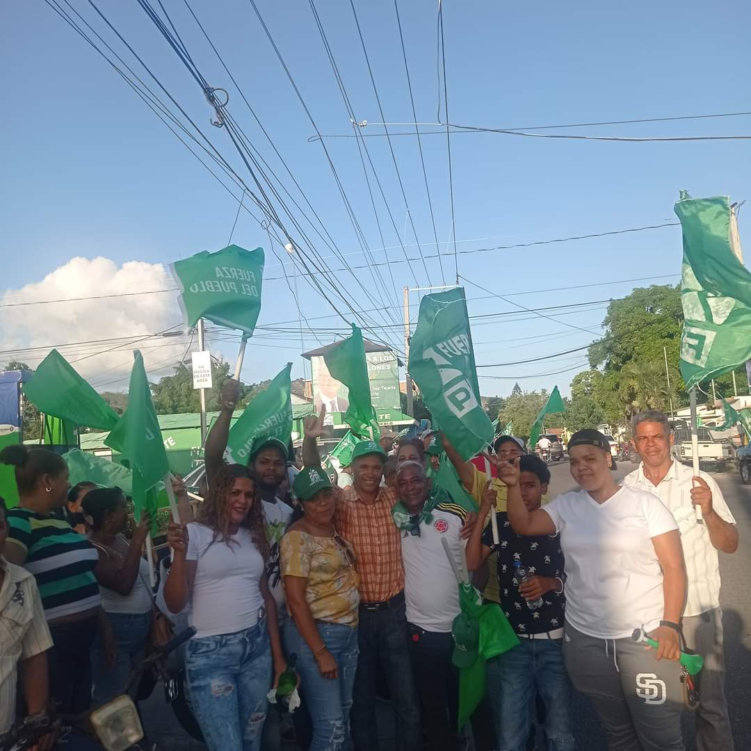 Los entusiastas miembros del partido Fuerza del Pueblo, ondeando sus banderolas de color verde de la esperanza, que portaban en sus manos, se colocaron en la acera del trayecto de la principal carretera del municipio, que une a Moca y Tamboril.