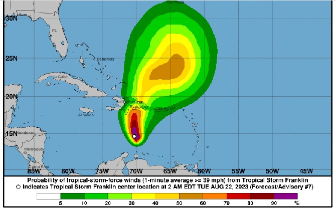 SANTO DOMINGO.– El centro de la tormenta tropical Franklin está a casi 400 kilómetros al sur de Santo Domingo, con vientos máximos sostenidos de 85 kilómetros por hora, moviéndose hacia el norte a 6 kilómetros por hora.