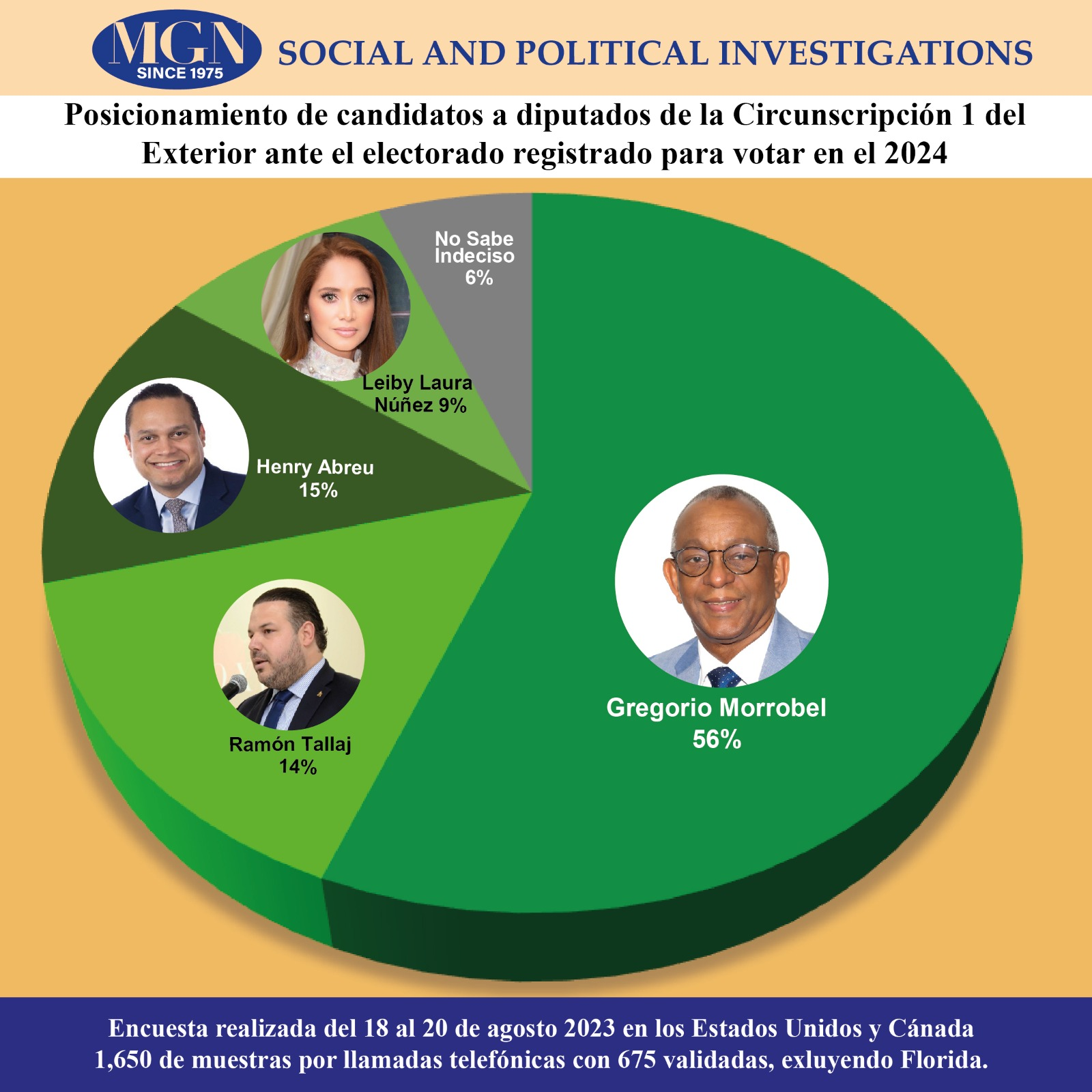 El estudio realizado por Social and Political Investigations, determinó que si la FP, realizara como ha decidido, escoger sus tres candidatos de la circunscripción #1 del exterior, por la vía de encuesta, Morrobel ganaría con el 56% de los votos, Henry Abreu con 15% Ramón Tallaj con 14%, y Leiby Laura Núñez con 9%.