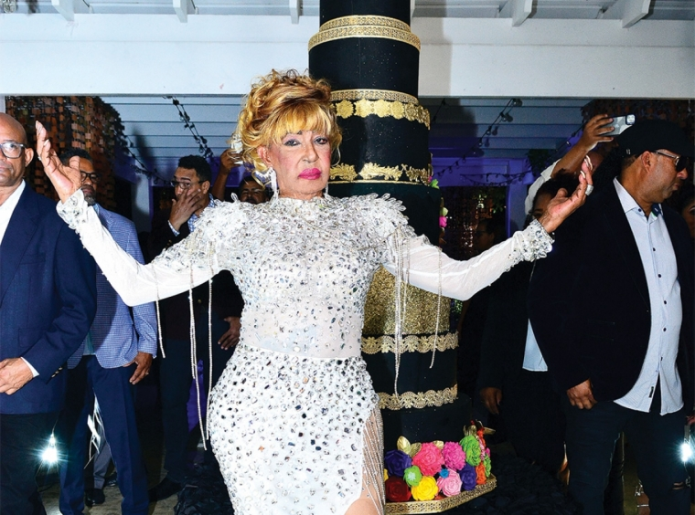 SANTIAGO.-Luciendo un diseño exclusivo de Giannina Azar, posando feliz para las cámaras y repartiendo besos, entró Fefita la Grande (La Vieja Fefa), a la fiesta donde celebró sus 80 años.