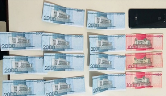 Al momento de su detención, el ciudadano arrojó al pavimento la cantidad de 11 billetes de 2,000 pesos, todos con la numeración EK5406966 presumiblemente adulterados, y la suma de 3,000 mil pesos en efectivo, así como también un celular.