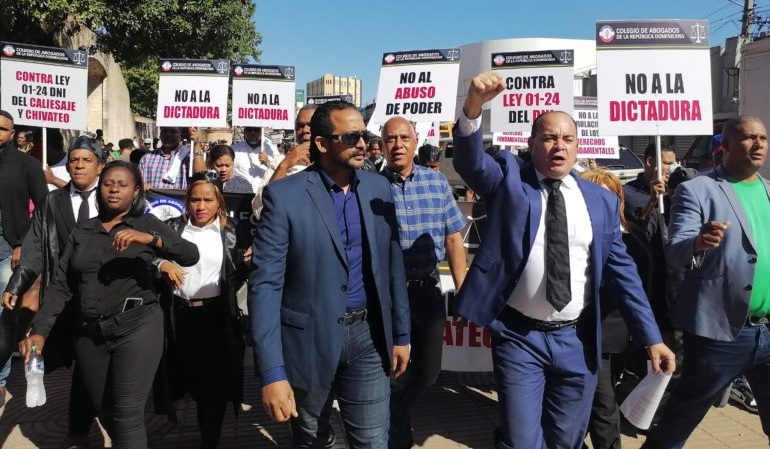 SANTO DOMINGO.-Juristas del Colegio de Abogados de República Dominicana (CARD), junto a organizaciones de la sociedad civil, marcharon hoy hasta el Palacio Nacional, en protesta contra la Ley 01-24, que crea la Dirección Nacional de Investigación (DNI).