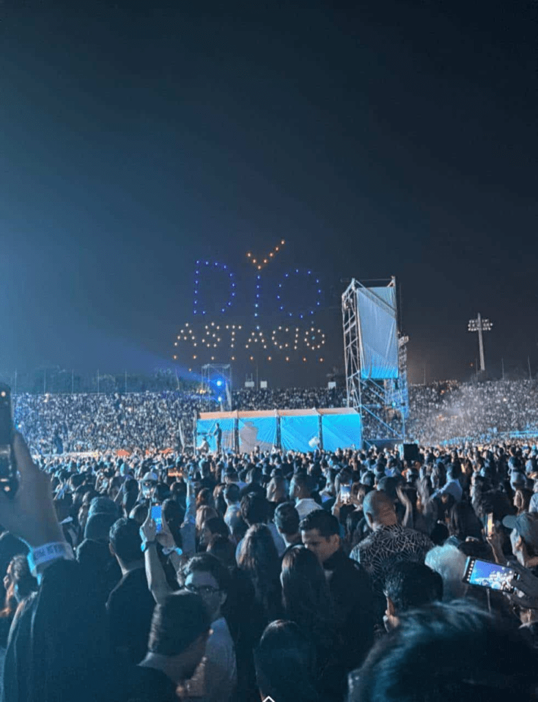 Aproximadamente a mitad del concierto y en un destello de tecnología, apareció en el cielo, a un costado de donde se desarrollaba el evento, un letrero promoviendo al Partido Revolucionario Moderno (PRM) y a su candidato municipal en Santo Domingo Este.