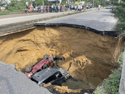 Los hechos ocurrieron a las tres de la madrugada cuando se desplomó una parte de la calzada, dejando un hueco de cinco metros de profundidad por donde cayeron dos vehículos y una motocicleta que circulaban en ese momento por el lugar.