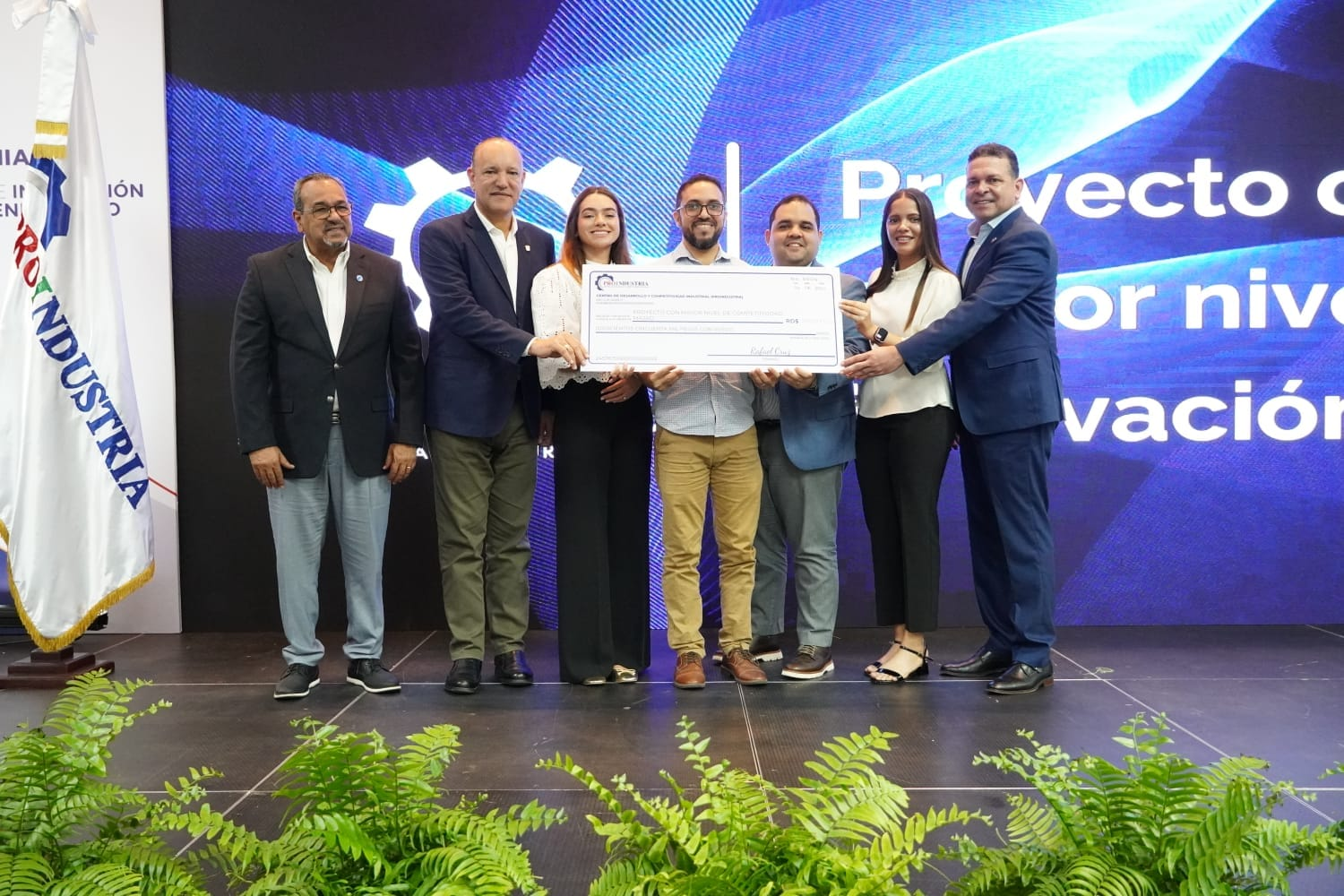 El director general de Proindustria, Rafael Cruz Rodríguez, acompañado por el subdirector técnico, Nilo De La Rosa, y la directora de Servicios de Apoyo a la Industria, Ilonka Acosta, encabezó la ceremonia de entrega de premios.