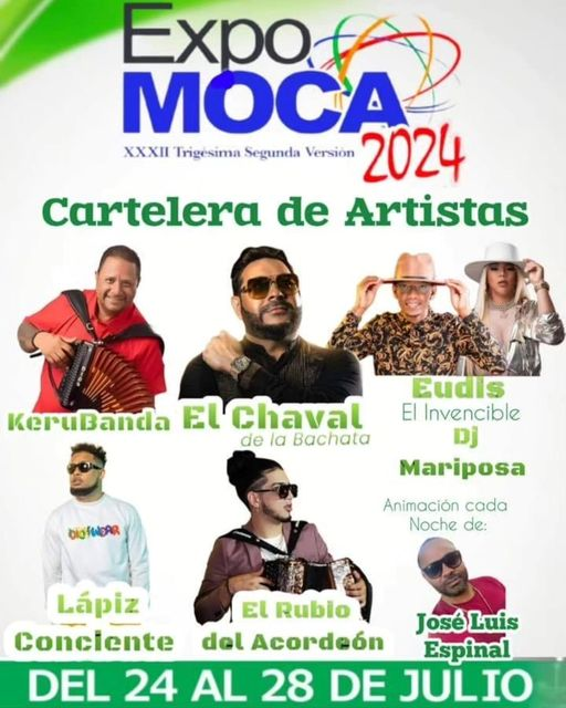 MOCA, Espaillat.-Con una cartelera artística explosiva de alegría y buena música, arranca del 24 al 28 de julio, la XXXII trigésima segunda versión de la feria Expo-Moca 2024, que organizan cada año la Asociación de Comerciantes Mayoristas en Provisiones de Espaillat (Asomaprom) y la Asociación de Mayoristas en Chucherías.