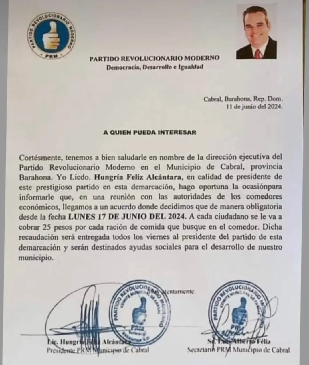 SANTO DOMINGO.- El director de los Comedores Económicos del Estado, Edgar Augusto Féliz Méndez, desmintió un documento difundido en medios de comunicación y redes sociales mediante el cual se anuncia el cobro de 25 pesos por almuerzo en el comedor de Cabral, Barahona.