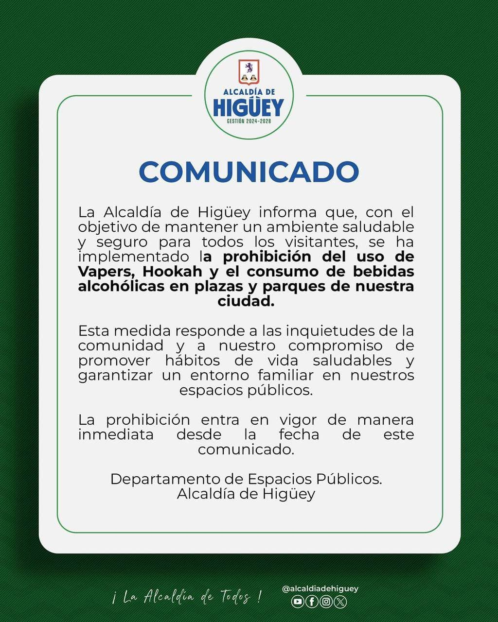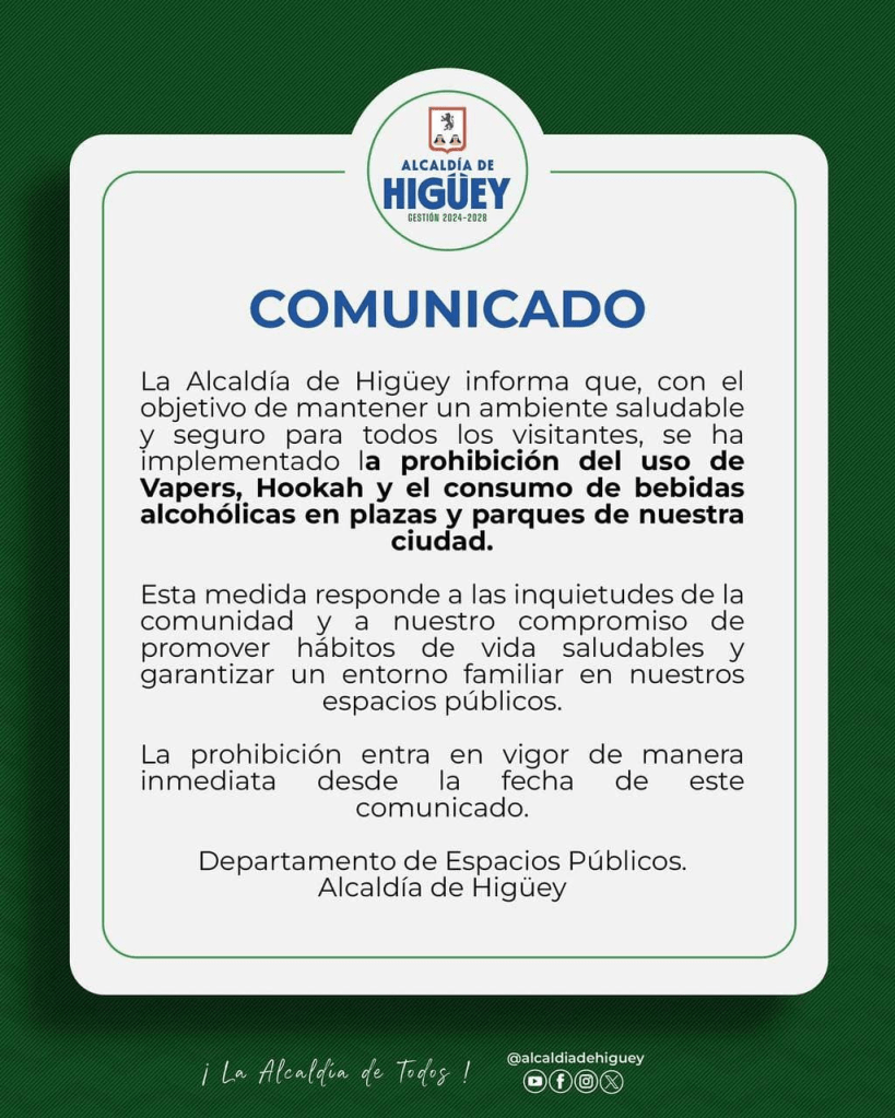 HIGUEY.-La alcaldesa del municipio de Higüey, Karina Aristy, anunció este lunes que queda «totalmente prohibido» el uso de vapers, hookah y el consumo de bebidas alcohólicas en plazas y parques de la ciudad.