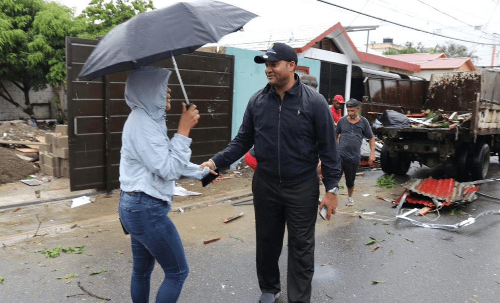 SALCEDO.-El alcalde Juan Ramón Hernández y el diputado Félix Hiciano anunciaron el restablecimiento de los servicios públicos, un día después del azote de un tornado que dañó decenas de viviendas.