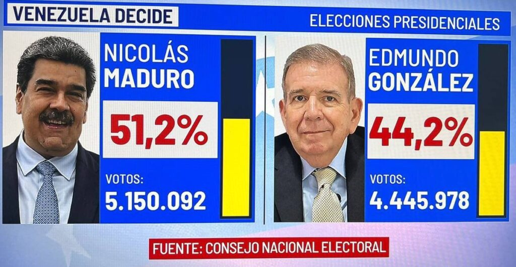 Dijo que Maduro ha obtenido 5,1 millones de votos, según el 80 por ciento del escrutinio, y que el candidato opositor, Edmundo González, ha quedado en segundo lugar con el 44 por ciento (4,4 millones de votos).