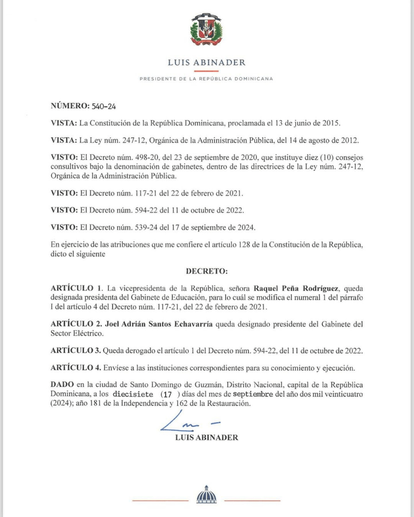 SANTO DOMINGO.-El presidente Luis Abinader emitió el decreto 540-24, mediante el cual designa a la vicepresidenta de la República, Raquel Peña Rodríguez, como presidenta del Gabinete de Educación.