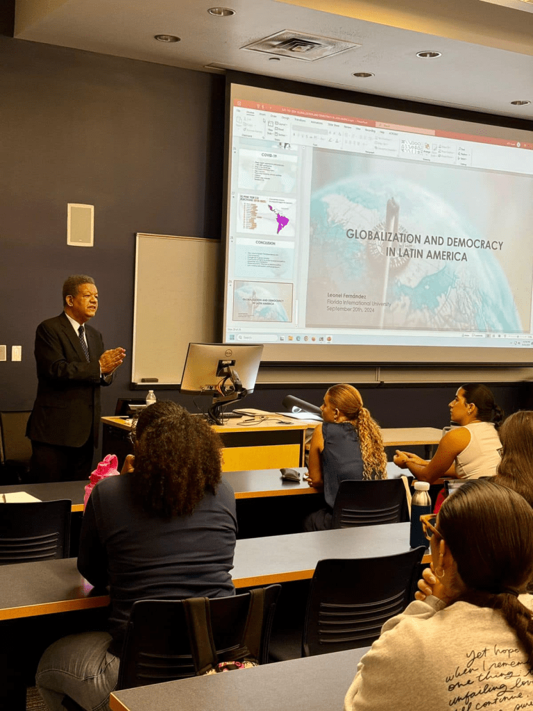 MIAMI, Florida.- El expresidente de la República Dominicana, Leonel Fernández, participó en una conferencia destacada en la Florida International University (FIU), donde se unió a los renombrados académicos Eduardo Gamarra y Daniel Pedreira para explorar el impacto de la globalización en la democracia en América Latina. Este evento reunió a estudiantes, académicos y miembros de la comunidad interesados en los desafíos actuales que enfrenta la región.