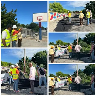 VILLA CENTRAL, Barahona.-El alcalde distrital Hamilton Nin, supervisó los trabajos de bacheo y construcción de una cancha de baloncesto en Los Solares de Milton.