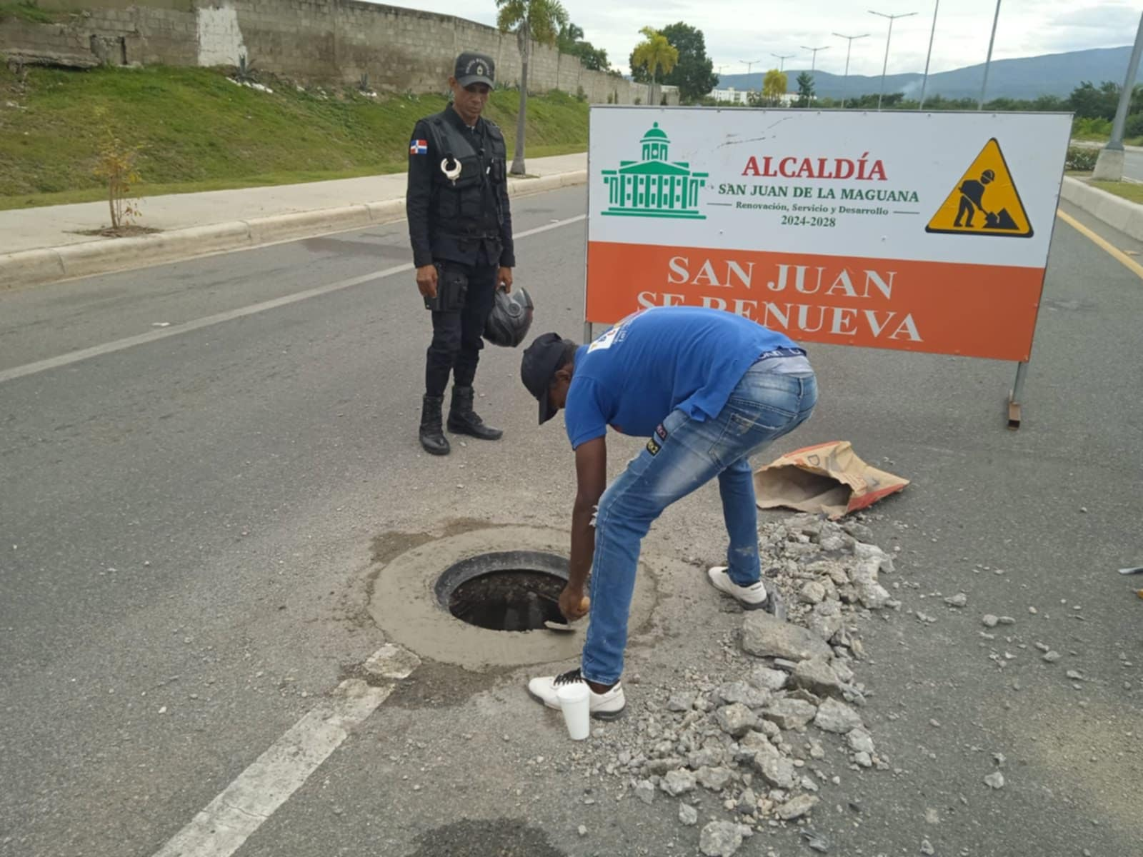 SAN JUAN DE LA MAGUANA.-Con la instalación de las tapas, también serán retirados los neumáticos que sIrven de señales para evitar que los conductores caigan en los peligrosos hoyos, como consecuencia de la sustracción y destrucción de las mismas.