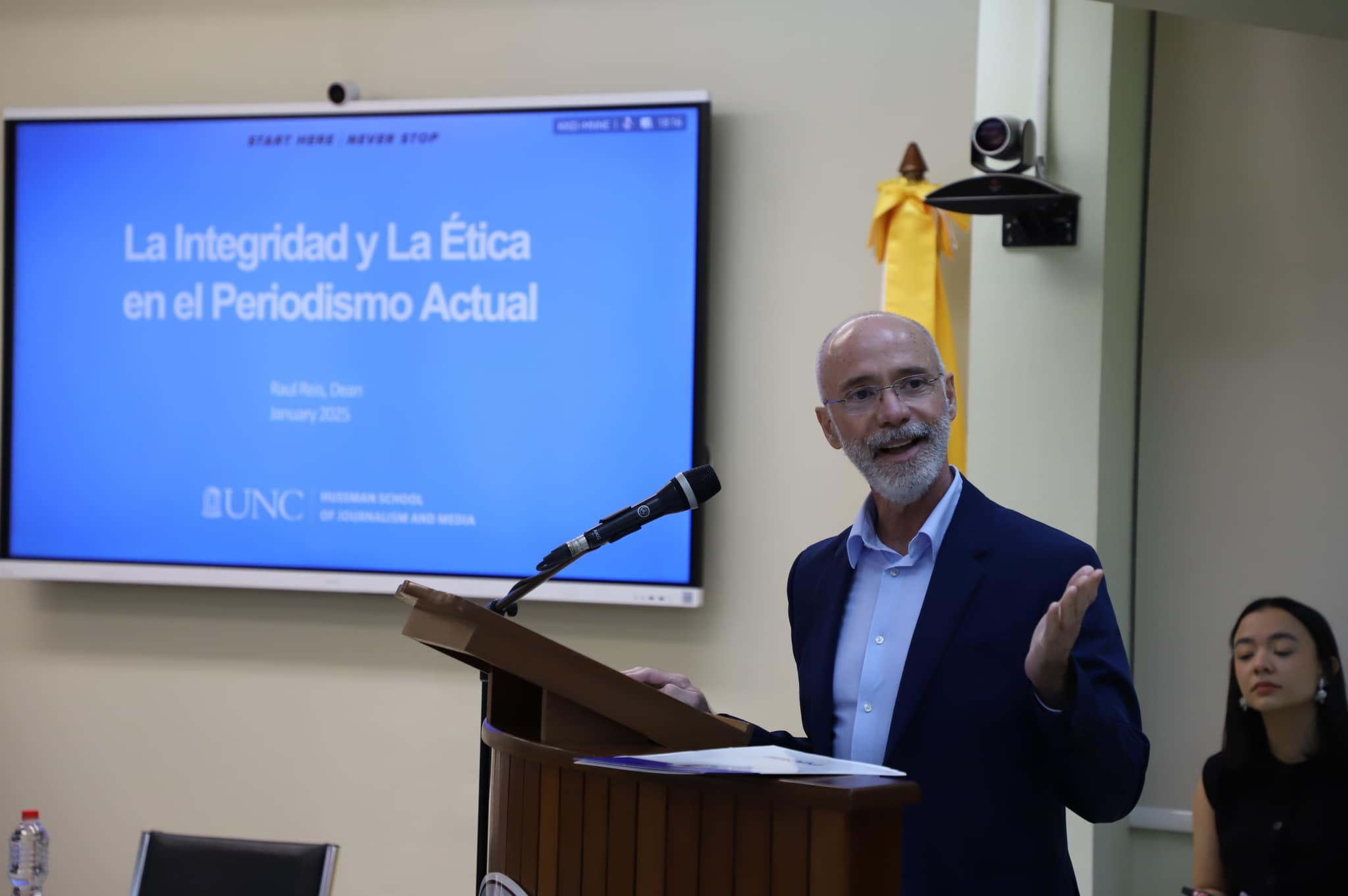 SANTO DOMINGO.-El profesor Raúl Reis, Decano de la Escuela de Periodismo y Medios Hussman de la Universidad de Carolina del Norte, encabezó un importante conversatorio en la Escuela de Comunicación de la Pontificia Universidad Católica Madre y Maestra (PUCMM) en República Dominicana, en el que participaron periodistas, docentes y estudiantes de periodismo para discutir temas esenciales en el campo de la comunicación.