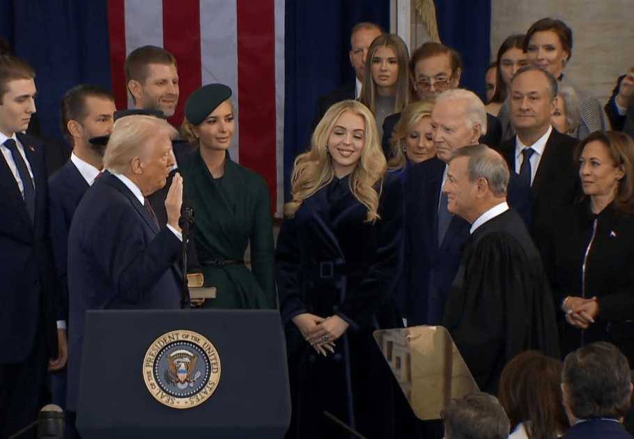 Tradicionalmente, el acto de toma de posesión se lleva a cabo al aire libre, en el lado oeste del Capitolio, frente al parque National Mall. Sin embargo, las bajas temperaturas obligaron a trasladar el evento al interior del edificio gubernamental. La toma de posesión empieza con la jura del cargo, primero del futuro vicepresidente James David Vance, seguido de Trump como jefe de Estado. El compromiso se realiza frente al presidente de la Corte Suprema, John Roberts.