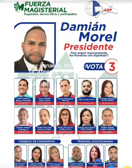 MOCA, Espaillat.-En el municipio cabecera de la provincia Espaillat, Fuerza Magisterial del Partido Fuerza del Pueblo, de la Asociación Dominicana de Profesores (ADP), resultó ganadora del proceso con Damián Morel como presidente, con 850 votos contra el maestro Ramón Basora 370 y José Miguel López con 280 votos.